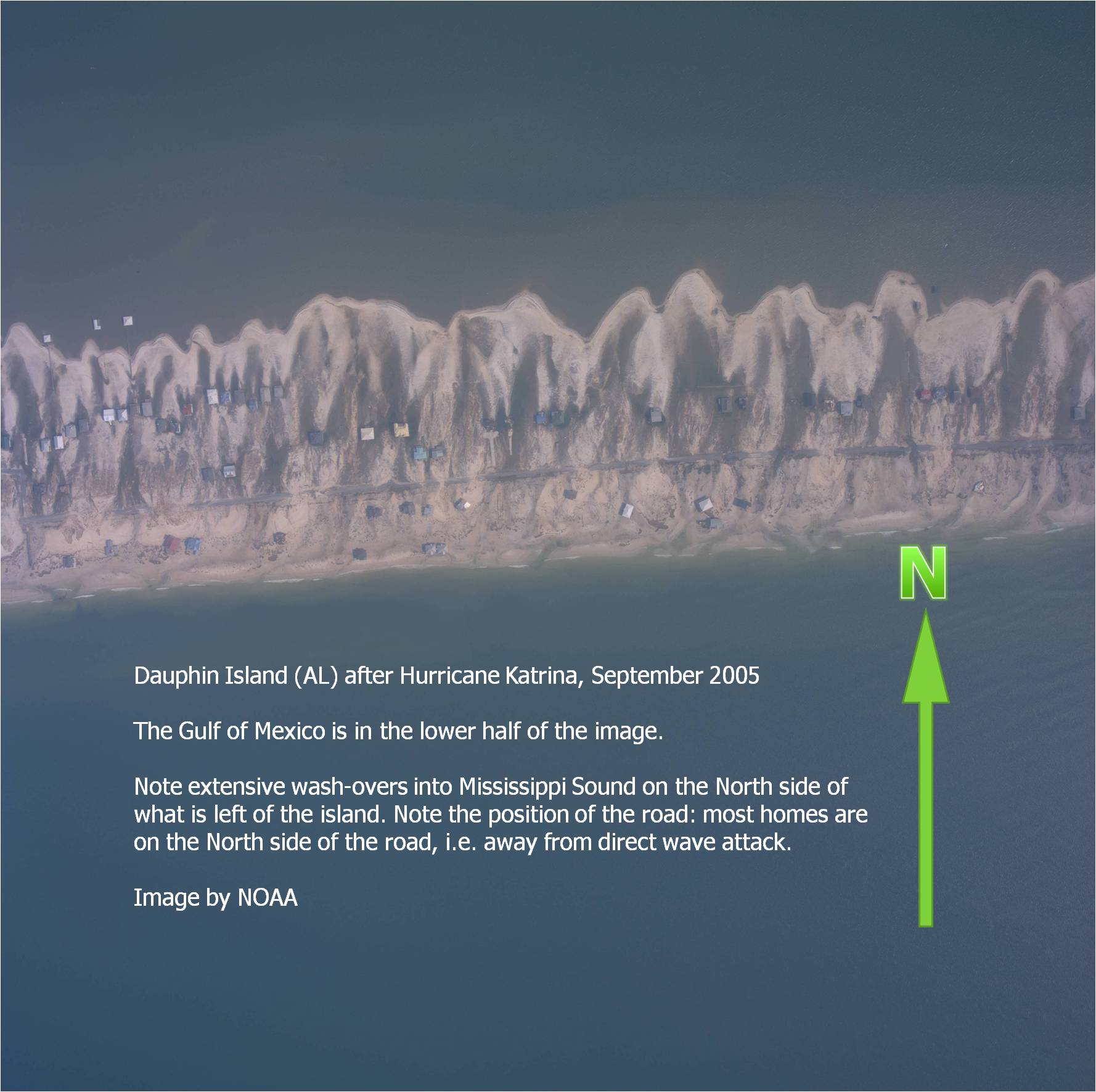 This is an image of part of Dauphin Island shortly after Hurricane Katrina. The wash overs are clearly visible. Note the position of the road: most houses (these are all vacation homes) are located on the landward side of the road.