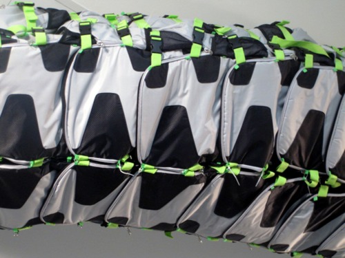 “Snake Ceiling” is made of hundreds of grey and green school backpacks, commemorating the thousands of children that died in the earthquake. Remember that many children were in school at the time the quake hit. They lost their lives because school buildings were constructed poorly, the construction industry is in the pockets of politicians and vice versa and corruption is rampant. Their deaths were unnecessary. You can’t walk under that massive, aggressive snake without feeling helpless, angry, and intensely sad. Rationally knowing that thousands of children lost their lives is not the same as being confronted with all those backpacks, each representing a happy child that danced to school that morning, before being lost forever, leaving broken lives and futures.