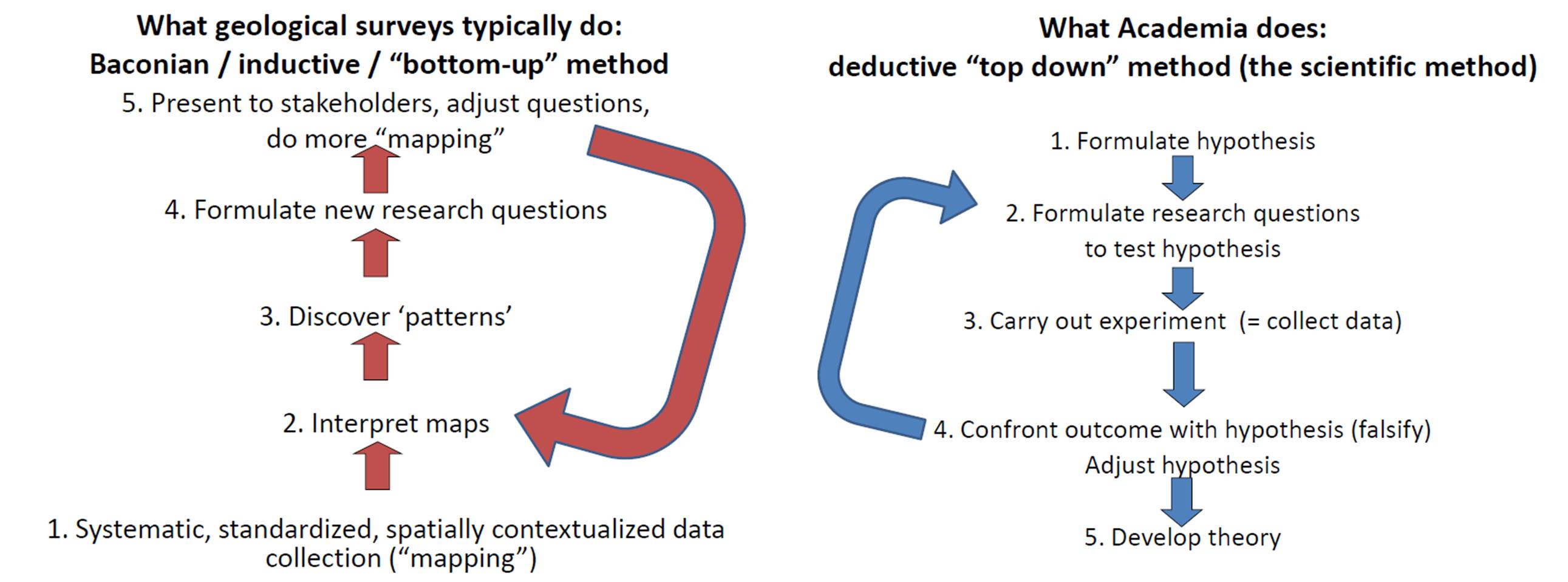 The role of geological surveys is also very different from that of academia, although they are both public institutions. The justification of university is the production of highly qualified personnel (graduates) and, in tandem, new knowledge. New knowledge produced by universities generally comes about in a different way than in a survey environment. The main difference between the two lies in the difference between deductive and inductive research methods. Deductive reasoning is the standard for Academia, but Geological Surveys must rely on inductive methods to produce the sort of knowledge that serves the broad public interest. Inductive research methodology leads to new knowledge, new questions and new insights just like deductive reasoning, and is none the less for it.