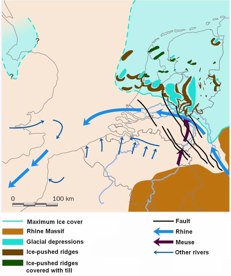 Figure 2. ‘Maximum ice cover’ is the maximum ice cover of the Saale/Illinoian glacial period. The ‘Glacial Depressions’ shown on this figure are Saalian in age and were inundated by the subsequent Eemian Sea (see figure 3). The Weichsel/Wisonsinan ice cap didn’t reach as far South as those of the Saale glacial. ‘Ice-pushed ridges’ are moraines. The ‘faults’ are part of the tectonic fabric of the failed rift system of the Rhine/North Sea. Figure from Vlaar, 2007