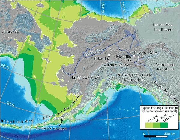 Alaska and Yukon during the Last Glacial Maximum (26,000-20,000 years ago). Global Sea Level stood ca. 120 m lower than today. The green colours show regions that are currently under water but were land during the LGM, thus forming a continuous land area between NW North America and NE Asia (the ‘Bering Land Bridge’). The pinkish area is now and was then land and it was largely unglaciated, except for local uplands. Figure 1 from the discussed paper. Original image from Ehlers and Gibbard, 2004.