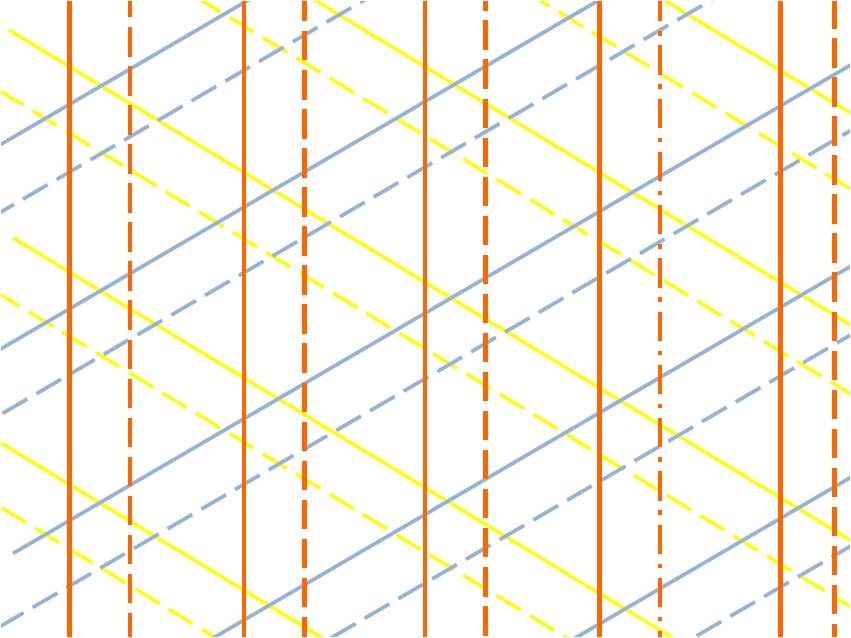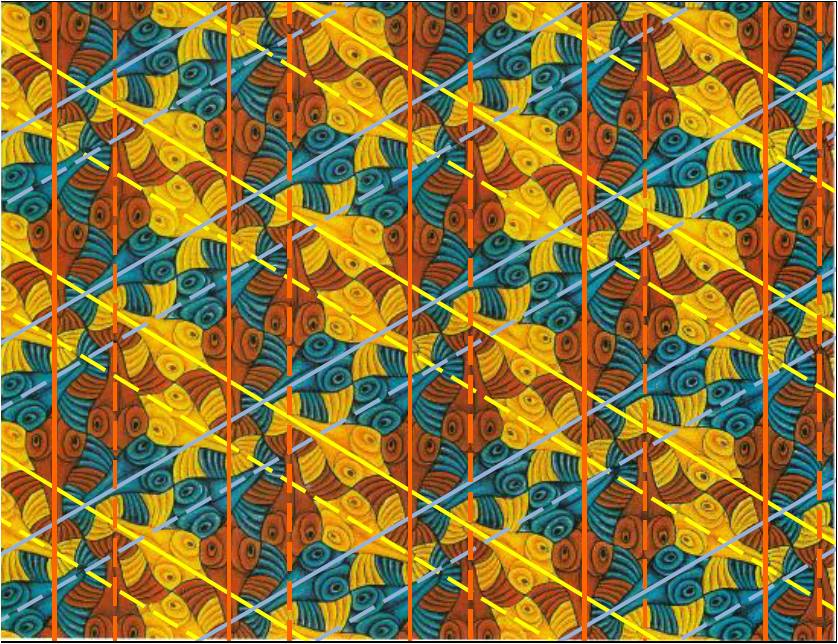 Left: M.C. Escher, 1942, Pattern #55 “Fish”. Centre: with lines indicating symmetry (drawn by me). Right: symmetry lines only, immediately showing 3-dimensionality.