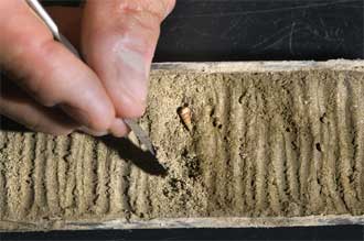 Left: A piston corer is launched over the side of a research vessel (image source here). Right: a core that’s cut open lengthwise to show finely layered sediment (image source)