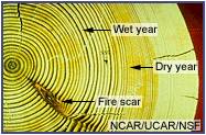 When tree rings are widely spaced, climate was moist and trees grew faster than during dry years, when the rings are more closely spaced.