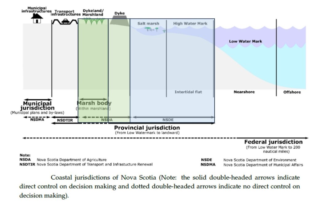 Nova Scotia’s coastal areas and dykelands are managed by a bewildering number of authorities, making for the sort of patchwork decisions illustrated above. The figure below is from a 2019 article by Nova Scotia researchers Rahman, Sherren and Van Proosdij (https://www.mdpi.com/2071-1050/11/23/6735): four different Provincial departments, individual Municipalities and the intergovernmental Marsh Body, plus the Federal Department of Fisheries and Oceans all have a say about various skinny intervals in the narrow belt between municipality and the open ocean. If this figure confuses you, you’re not alone.