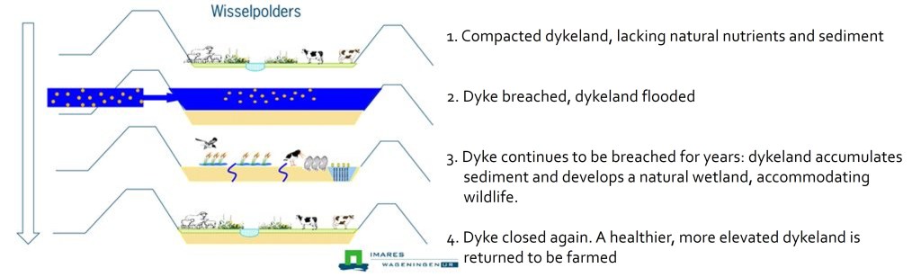 But if sea level rises 1.8 meters (6 feet) before the end of the century, saltwater intrusion in dykeland is only going to get worse, thus limiting potential crops (at present mostly grass, corn and soybeans and an occasional industrial site). The estimated sea level rise is why most dyke levels are scheduled to be increased by 6 feet in the next few years. Many readers will probably think that the Netherlands has practiced agriculture below sea level for centuries so we can surely do that too around Minas Basin? Well, it’s not the same – at all. First of all, the largest tide range along the Dutch coast is just over 4m, about 1/3 of the tidal range in Minas Basin. A lower tide range necessitates lower dykes. In addition, many of the Dutch dykelands exist next to major cities (Rotterdam, Amsterdam, The Hague, Delft) that are crucial economic drivers. No Minas Basin dykeland can make that claim. The Dutch government has changed its approach to dealing with the rising sea from ‘working against nature’ to ‘working with nature’ because the first approach, which they’ve practiced for hundreds of years, is no longer working in an age of rapidly rising sea level. This new approach applies to the entire country, not just to individual municipalities or sections of dykeland. By far the most interesting innovation under this umbrella of innovative measures is the ‘Wisselpolder’, a fabulous term that’s hard to translate. I’ll call it the ‘on-off dykeland’. The practice is shown here