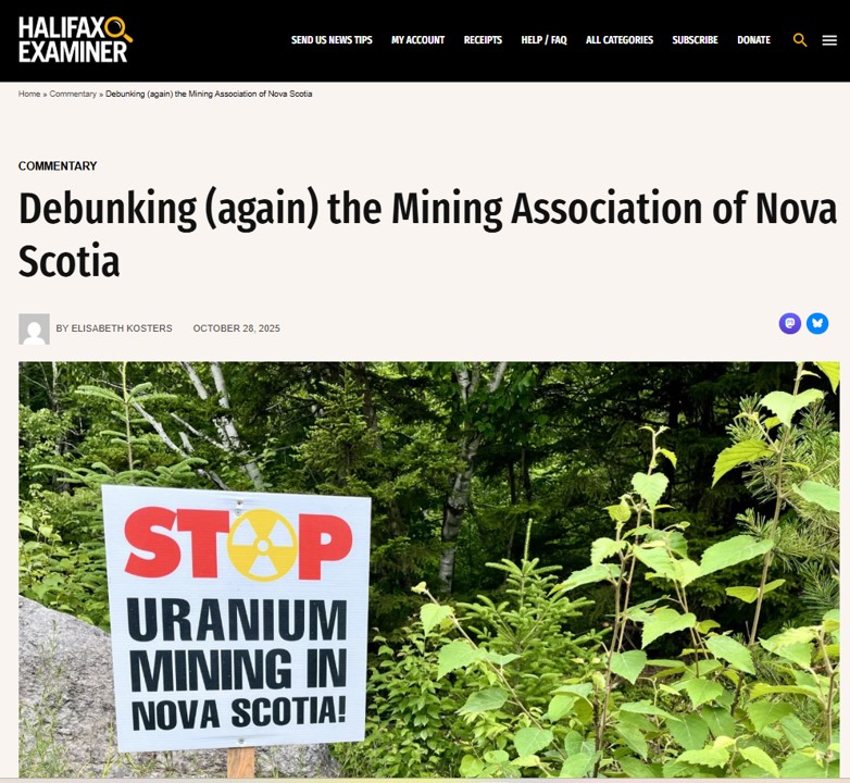 And then mr Kirby says “Experts like the Canadian Nuclear Safety Commission say uranium mining is safe for people and the environment, and decades of experience in Saskatchewan prove it. There is clearly no health, safety or environmental reason to ban uranium.” Can mr Kirby point us to the location of this quote? Because I can’t find it on the CNSC’s website. The only Uranium mines in Canada still in operation are the ones far away from human habitation. Madawaska, Agnew Lake and Elliott Lake, all in southern Ontario, are closed and there are massive and well-documented public health issues resulting from Uranium contamination in those areas. And please don’t tell me that these mines operated decades ago, but we now know how to mine safely. Because open pit Uranium mining (which is what happened in those areas and what would be the process in southern Nova Scotia) always creates radioactive dust, which is a huge public health risk.